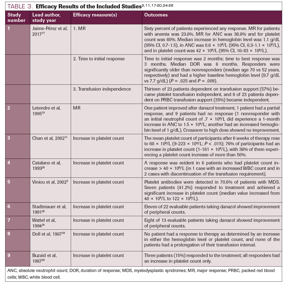 In Catalano et al, 6 of 47 patients who received 400 to 600 mg of daily danazol showed a major response in platelet count and 1 of 47 and 2 of 47 patients showed a major response in ANC and hemoglobin level, respectively. 26 Similar results were demonstrated by Chan et al—10 of 33 patients administered 200 to 600 mg of daily danazol showed a major response in platelet count.11 Major responses were satisfactorily obtained in all studies that mentioned it. In the study done by Jaime-Pérez et al, more than half of the participants experienced an increased platelet count.14 In the study performed by Buzaid et al, all the participants who did not improve had RAEB.20 Stadtmauer et al and Letendre et al both reported an elevated hemoglobin level as the minor response achieved.18,25 However, the findings were contrary in Doll et al.19 None of the participants showed an increased platelet count at a dose of 800 mg/day of danazol. Table 32,11,17-20,24-26 details the outcomes of each study.
