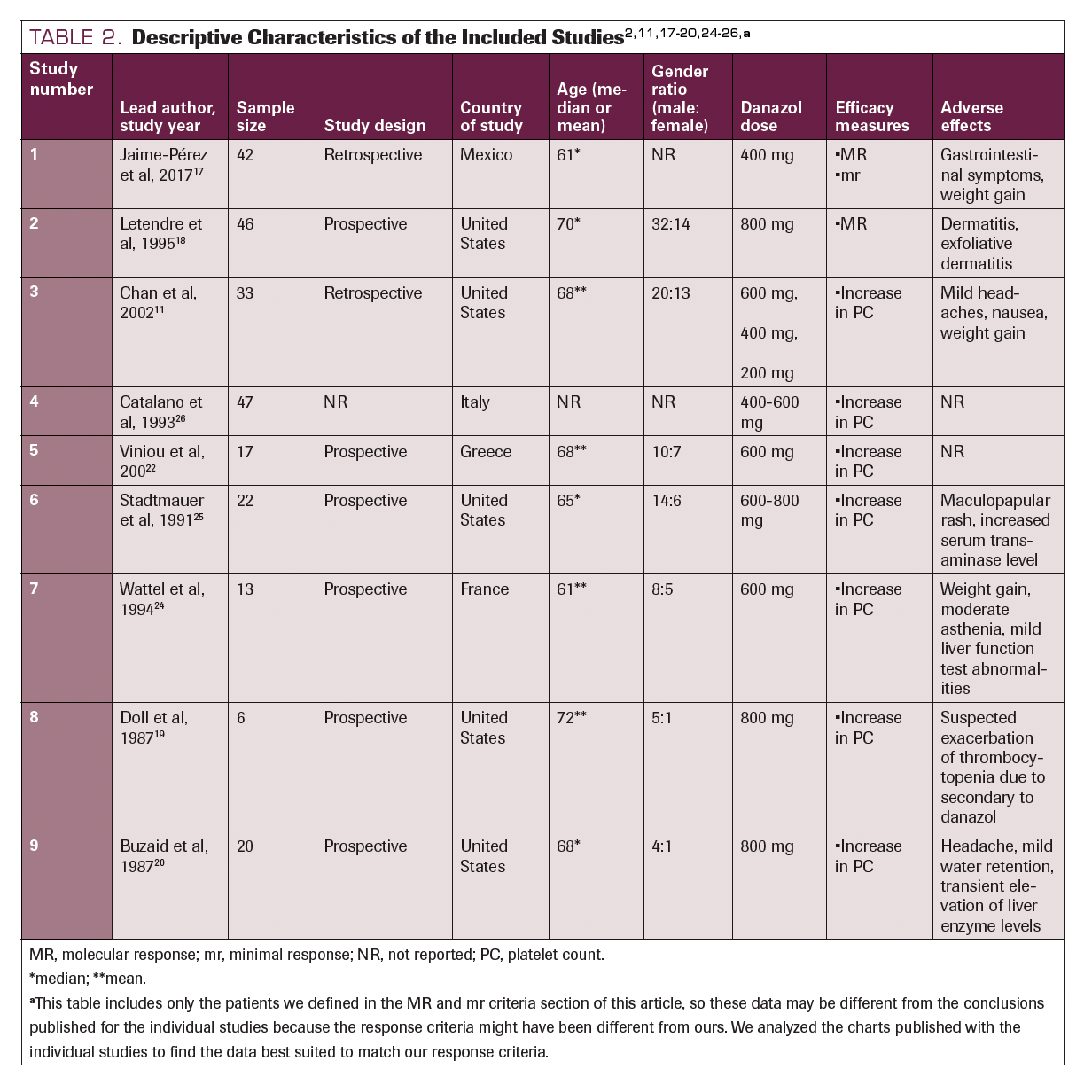 Nine studies consisting of 246 participants were included in our review. Six were prospective observation studies, and the remaining 4 studies were retrospective. Six studies were performed in North America (5 of which in the United States), and 3 studies were conducted in Europe. The age of the participants ranged from 61 to 72 years, and all 9 studies enrolled more male than female patients. All the studies reported the dose of danazol administered and at least 1 of the efficacy measures (major response, minor response, or increased platelet count). Seven studies reported the AEs of danazol observed in the patients. The descriptive characteristics of the 9 included studies are detailed in Table 2.2,11,17-20,24-26