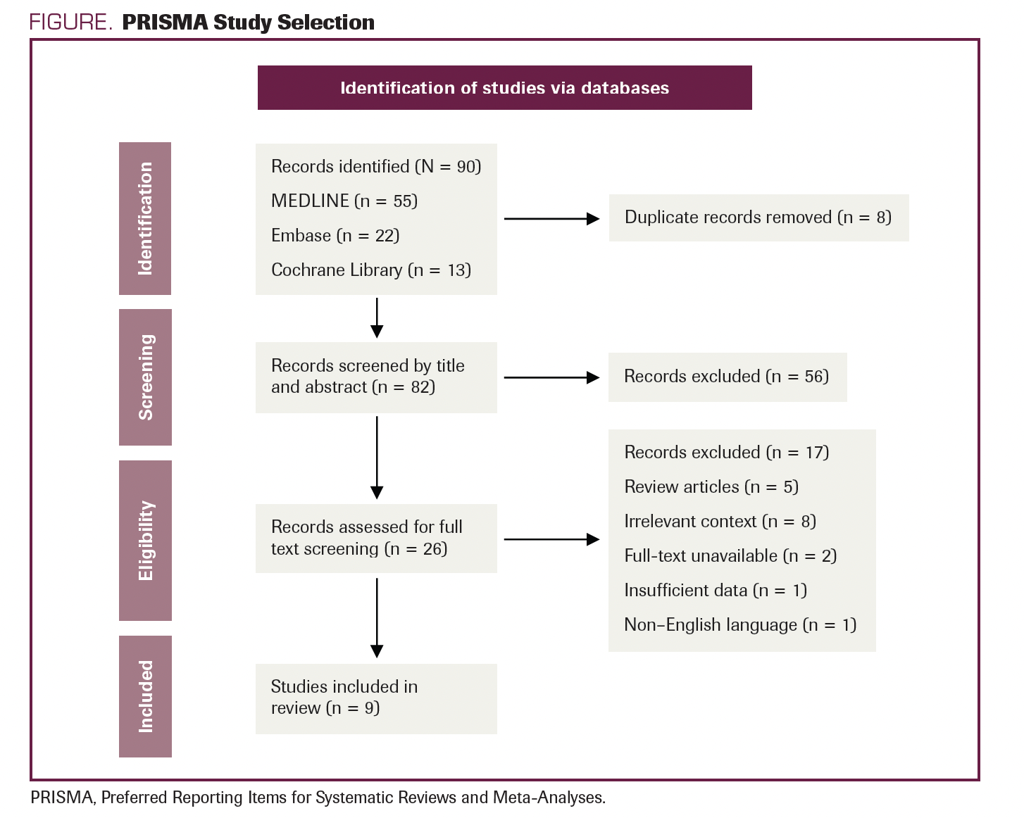 The literature search resulted in the retrieval of 90 studies. After the complete screening process of titles, abstracts, and full texts, 81 studies did not meet the eligibility criteria. Nine articles with various study designs that met the criteria were included in the review. A description of study selection is shown in the PRISMA flow diagram in the Figure.