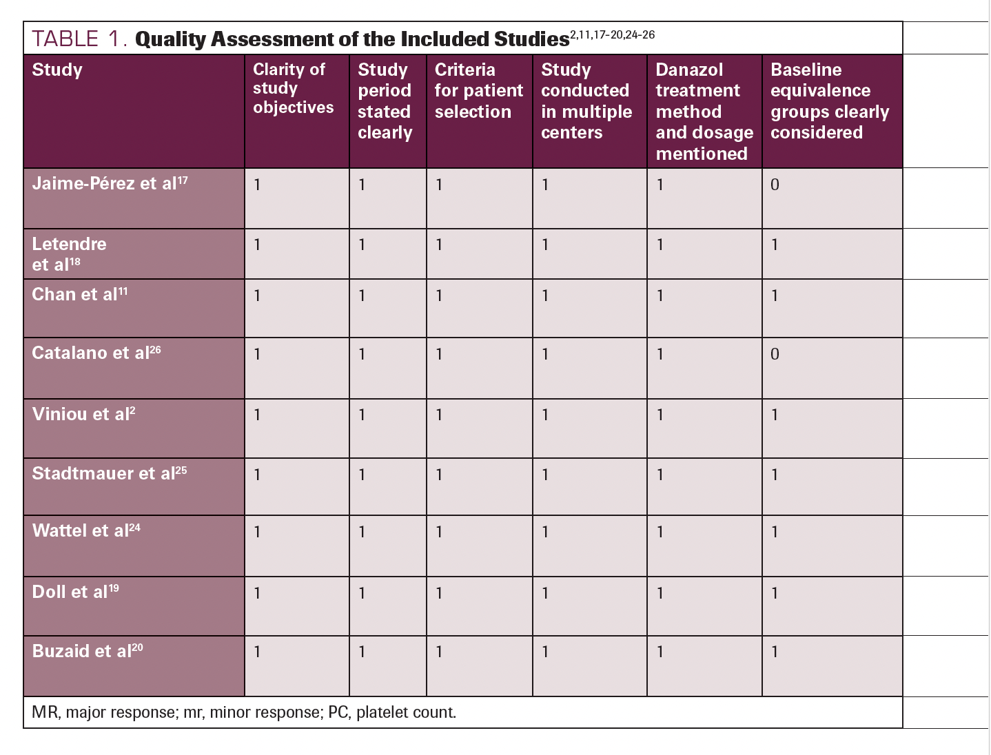 Nine studies consisting of 246 participants were included in our review. The overall quality of the included studies was fair. The age of the participants ranged from 61 to 78 years. In all 9 studies, more male patients had been enrolled than female patients. Overall, a proportion of patients in all the studies reported a desired major response to a danazol dose of 400 to 800 mg/day. Few studies did not observe any improvement in the platelet count. Elevated liver enzyme levels, weight gain, headache, dermatitis, and weakness were the most common AEs observed. One study reported a fatal intracerebral hemorrhage in 1 participant.
