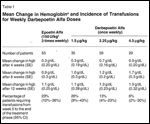 The efficacy end points evaluated included hemoglobin response (³ 2.0 g/dL increase in hemoglobin over baseline in the absence of a red blood cell transfusion in the past 28 days), hemoglobin correction (hemoglobin ³ 12 g/dL in the absence of any red blood cell transfusion in the past 28 days), and hematopoietic response (hemoglobin value > 12.0 g/dL or a ³ 2.0-g/dL increase in hemoglobin over baseline in the absence of a red blood cell transfusion in the past 28 days) as defined in previous studies with epoetin alfa,[5,6] and mean change in hemoglobin from baseline. The incidence of red blood cell transfusions from week 5 to the end of the treatment phase was also evaluated.