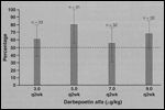 In keeping with common medical practice, subjects in the epoetin alfa group could have their dose increased to 60,000 U weekly at day 35 (study week 6) if they had an inadequate initial response. Day 35 was chosen for increasing the epoetin alfa dose based on data available at the time of initiation of the study with regard to common community practice with this agent. No patients receiving darbepoetin alfa were permitted to receive a dose increase at any time during the study; therefore, a direct comparison of the efficacy of an individual dose of darbepoetin alfa with epoetin alfa may be confounded for some end points. However, descriptive comparisons can be made between the two groups.