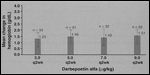 The mean (standard error) change in hemoglobin concentration from baseline to the end of the treatment phase was higher in the 5.0-µg/kg group than in the 3.0-µg/kg group, but no appreciable additional increase was observed at higher doses (Figure 4). Using an alternative statistical approach in which only those subjects who completed dosing were included in the analysis, the mean change in hemoglobin from baseline in the 3.0-, 5.0-, 7.0-, and 9.0-µg/kg dose groups was 0.61, 0.58, 0.61, and 1.23 g/dL at week 4, respectively, and 1.61, 2.36, 2.35, and 2.39 g/dL at week 13, respectively.