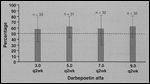 All groups of darbepoetin alfa achieved a hemoglobin response of ³ 50%, with the 5.0-mg/kg group achieving higher observed efficacy than the 3.0-µg/kg group for hemoglobin end points (Figure 2). For example, the Kaplan-Meier estimate for the proportion of patients achieving at least a 2-g/dL increase in hemoglobin from baseline was 60% in the 3.0-µg/kg group and 79% in the 5.0-µg/kg group. All dose cohorts of darbepoetin alfa also achieved a ³ 50% rate of hemoglobin correction over the course of the treatment phase (Figure 3), and all darbepoetin alfa doses appeared to be equally effective. Hematopoietic response rates (Kaplan-Meier proportion) were 66% (95% CI = 46%-86%), 84% (95% CI = 67%-100%), 58% (95% CI = 35%-82%), and 71% (95% CI = 53%-89%) for the 3.0-, 5.0-, 7.0-, and 9.0-µg/kg dose groups, respectively.