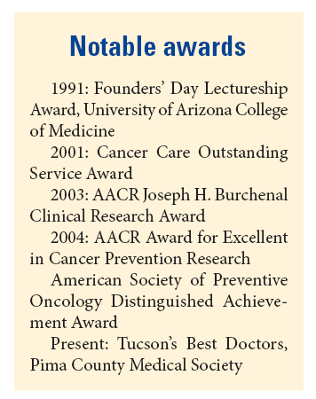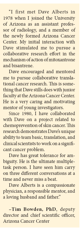 In 1989, Dr. Alberts was director of the clinical pharmacology section when he received a summons from the boss: Dr. Salmon wanted him to start a cancer control program. “I said, ‘No, I’m running the pharmacology program.’ So Dr. Salmon took me to the chair of the department of medicine who said, ‘Dave, you’re going to start a cancer prevention and control program, or you are never going to get another raise as long as you are here.’” “I put out an SOS to the entire university faculty and called a meeting-three people showed up: cancer biologist Tim Bowden, PhD, nutritional anthropologist Cheryl Ritenbaugh, PhD, and a biostatistician” he added. “I thought that was a pretty good start. I said to Dr. Salmon, ‘What resources are you going to make available to start this program?’ He said, ‘None.’”