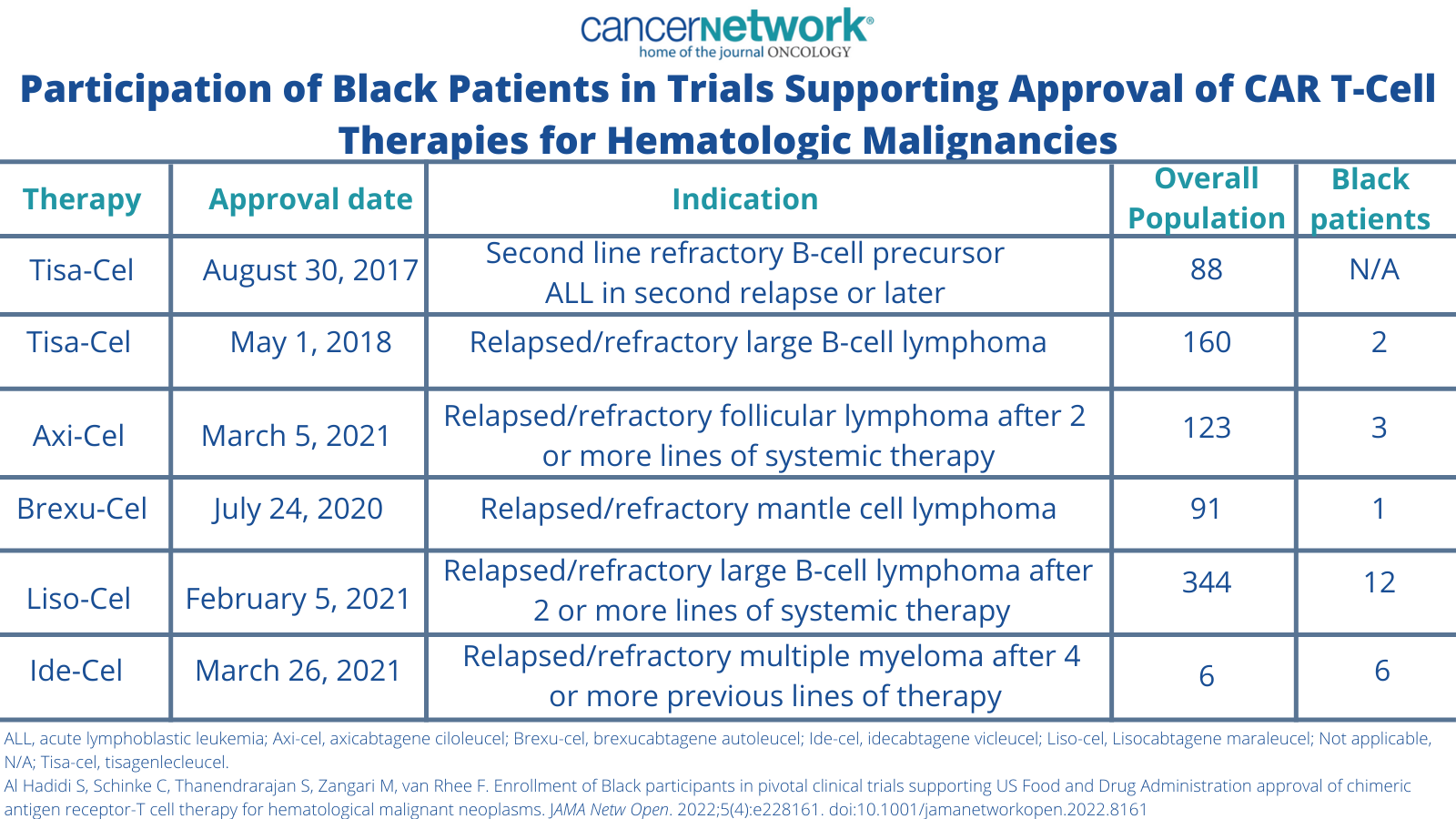 Participation of Black Patients in Trials Supporting Approval of CAR T-Cell Therapies for Hematologic Malignancies