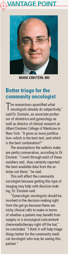 Julie K. Schwarz, MD, and colleagues at Washington University in St. Louis and Vanderbilt University in Nashville, Tenn., determined that the addition of FDGPET/ CT to the evaluation of patients with locally advanced cervical cancer changed management in approximately one-third of the cases, and reduced overall treatment costs by accurately identifying which patients would benefit from surgery.
