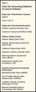 Numerous scales or instruments have been developed to aid the clinician in rapidly screening for cognitive impairment disorders (dementia or delirium), or in establishing a diagnosis of delirium (see Table 2).[38- 46] Such scales have been described, and their relative strengths and weaknesses reviewed elsewhere.[43,47] Perhaps most helpful to clinicians are the Mini-Mental State Examination (a cognitive impairment screening tool) and several delirium diagnostic and severity rating scales, including the Delirium Rating Scale, the Delirium Rating Scale-Revised-98, the Confusion Assessment Method, the Abbreviated Cognitive Test for Delirium, and the Memorial Delirium Assessment Scale. These tools are briefly described in the subsections below.