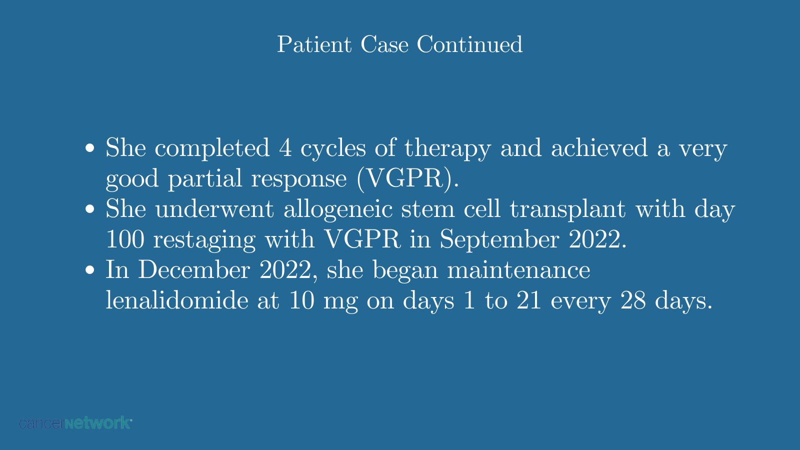 Nooka: This has been our practice for the last 5 years, and using the quadruplet agents, we’re able to get those depths of responses that we have not been seeing with the [triplet] treatments. However, in the post-transplant setting, we’ve resorted to going onto single-agent maintenance, which differs slightly from the existing literature.
