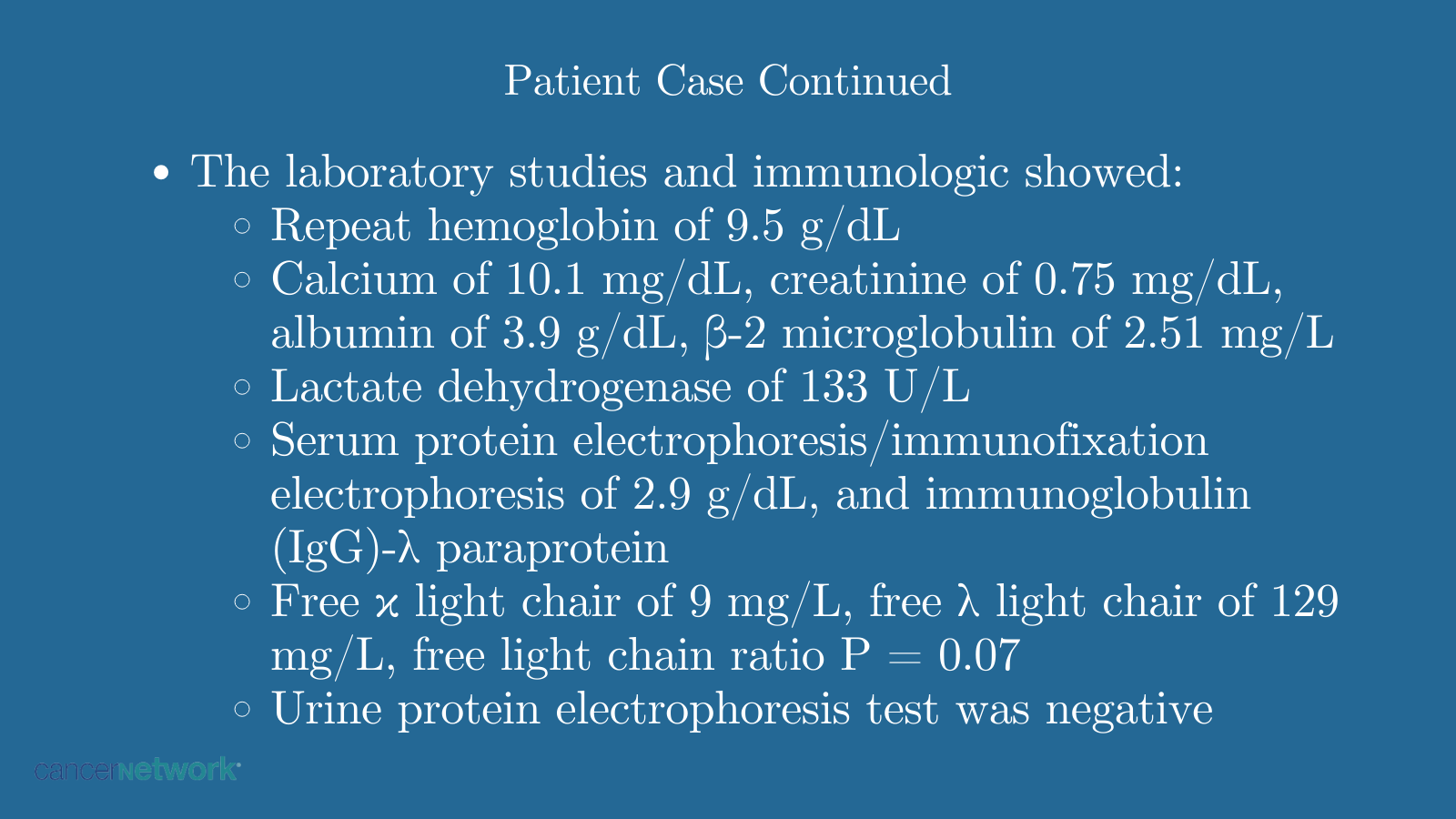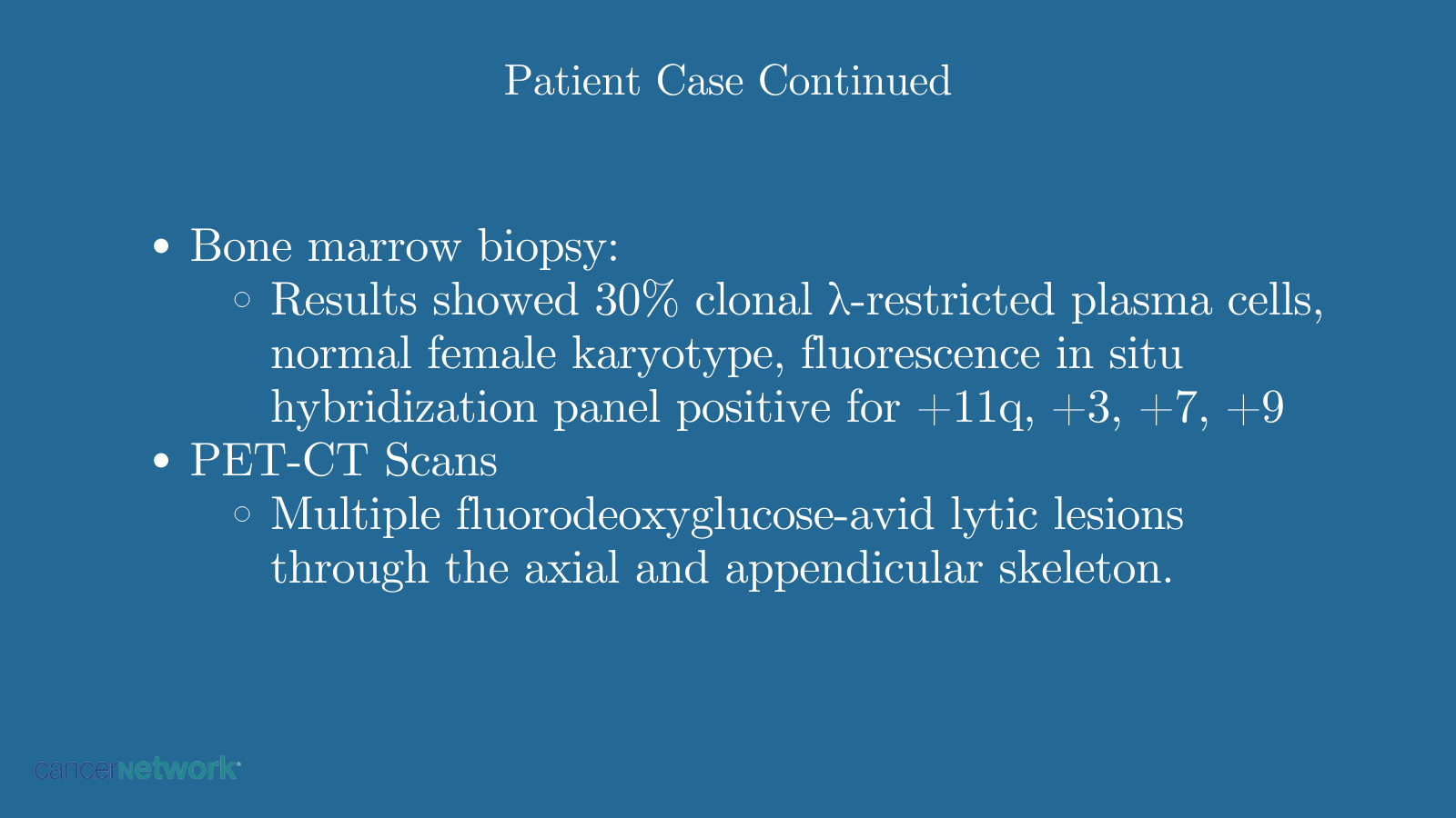 Kaufman: This is a typical case. The patient has clearly symptomatic myeloma with anemia and lytic bone disease, standard-risk disease, and our approach has been—for patients who are standard-risk—to give the quadruplet of Dara-RVd and offer early autologous transplant followed by lenalidomide maintenance.