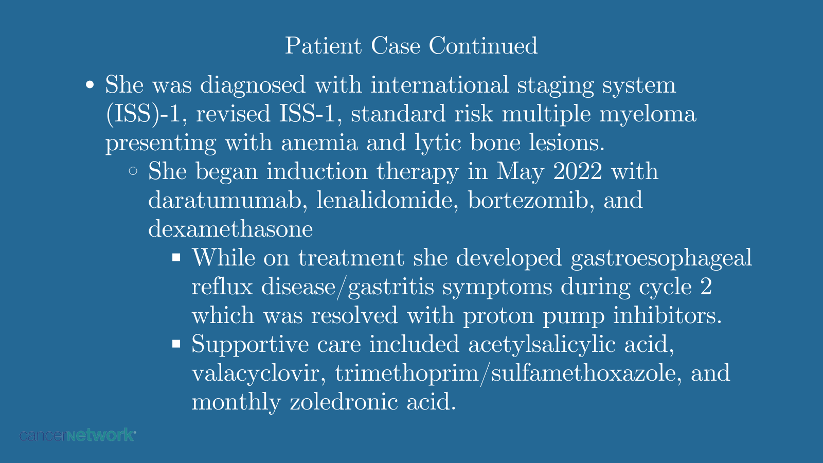 The panel specifically discussed how a quadruplet regimen consisting of daratumumab (Darzalex), lenalidomide (Revlimid), bortezomib (Velcade), and dexamethasone (Dara-RVd) for this patient case has become the standard of care. However, the experts debated the appropriate use of a triplet vs quadruplet therapy, and how they would approach selecting patients for each resoective regimen.