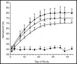 As has been shown for rHuEPO, darbepoetin alfa produced a dose-dependent increase in the hematocrit of normal mice when injected by the intravenous, intraperitoneal, and subcutaneous routes.[13] Initial experiments focused on comparing the efficacy of the two molecules when administered three times per week. In the experiment shown in Figure 7, thrice-weekly intravenous dosing with 1.25 µg/kg of darbepoetin alfa increased the hematocrit of mice to approximately 75% in 6 weeks; however, a comparable hematocrit increase with rHuEPO at this dosing frequency required 5.0 µg/kg. When the data from all experiments were combined, darbepoetin alfa was determined to be approximately 3.6-fold more potent than rHuEPO when administered three times per week by any route of administration.