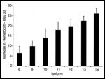 rHuEPO, produced by Chinese hamster ovary cells, was purified to contain the entire complement of isoforms 4 to 14, and then further fractionated by ion exchange chromatography to isolate the individual isoforms.[12] The in vivo efficacy of each of the individual isoforms was tested in normal mice to determine the effect of repetitive dosing on the hematocrit. In this assay, CD-1 mice were injected with either a vehicle control or an equimolar dose (2.5 µg/kg of peptide) of each of the individual isoforms by intraperitoneal injection three times per week for 1 month. The results of this experiment demonstrated a striking difference in the biological activity of the individual isoforms, with those isoforms having a higher sialic acid content exhibiting a progressively higher in vivo efficacy (Figure 2). By day 30, the group mean hematocrit of isoform 14-treated animals increased by 26.2 ± 2.7 points (to a hematocrit of 76.2%), compared with an increase of only 6.3 ± 3.5 points for the isoform 8-treated group, a 4.2-fold increase in efficacy. In contrast, animals receiving vehicle control showed no hematocrit change from baseline during the experiment.
