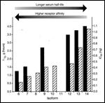 It was reasoned that these results might have two possible explanations: the more active isoforms might have a longer serum half-life and/or an increased ability to bind to the EPO receptor. In order to assess the contribution of each of these possibilities, the pharmacokinetics and receptor-binding activity of the individual isoforms was measured.