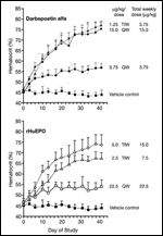 Darbepoetin alfa can successfully increase the hematocrit of mice when administered once per week (Figure 7). A once-weekly dose of 15 µg/kg darbepoetin alfa produced a nearly identical biological response in normal mice as did a thrice-weekly dose of 1.25 µg/kg (3.75 µg/kg total weekly dose). Thus, for darbepoetin alfa, an approximate fourfold weekly dose increase is required to change from thrice-weekly to once-weekly dosing in this animal model. It is important to note, however, that in human clinical studies, there were no apparent differences between once-weekly and thrice-weekly dosing with darbepoetin alfa.[42] The optimal weekly dose was the same whether administered once per week or as three divided doses. The differences observed between the small animal model, and human clinical trials are presumably due to the differences in the erythrokinetics and red blood cell lifespan of the two species.