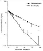 The first step in the clinical program to determine if darbepoetin alfa is both more potent than epoetin alfa and can be administered less frequently, was to verify that darbepoetin alfa had a longer serum half-life in patients. In a double-blind, randomized crossover study, the single-dose pharmacokinetics of epoetin alfa (100 U/kg) and an equimolar dose of darb-epoetin alfa were compared after intravenous administration to 11 stable peritoneal dialysis patients.[43] Serum levels of darbepoetin alfa and rHuEPO were determined at regular intervals up to 96 hours after dosing by immunoassay. In all patients, darbepoetin alfa had a longer terminal half-life than epoetin alfa (Figure 9). The mean terminal half-life for darb-epoetin alfa following intravenous injection was 26.3 hours, approximately three-fold longer than that determined for epoetin alfa (8.5 hours). There was no significant difference in the volume of distribution for the two molecules. This first study in man confirmed and extended the observations in animal studies with darbepoetin alfa, demonstrating that due to its increased sialic acid-containing carbohydrate content, darbepoetin alfa has a decreased clearance and longer serum half-life than rHuEPO.