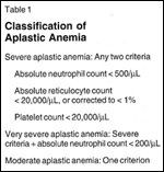 Patients with aplastic anemia are classified as having moderate, severe or very severe disease based on the number of lineages affected and the severity of the neutropenia (see Table 1). This classification is of prognostic significance for patients receiving medical therapy.[6,7] Bone marrow transplantation has typically been reserved for treatment of severe or very severe aplastic anemia.