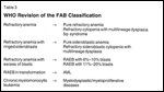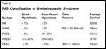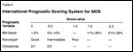 The heterogeneity of myelodysplastic syndrome makes it a difficult disease to classify. The original French/American/British (FAB) classification was established to better characterize the morphologic features of myelodysplastic syndrome and to describe various subtypes.[8] Subsequently, this classification (see Table 2) was found to have prognostic value.[9] The prognostic scoring systems for myelodysplastic syndrome have been progressively refined.