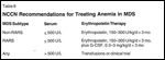 Based on the available data, the National Comprehensive Cancer Network (NCCN) published guidelines in 1998 for the treatment of anemia in myelodysplastic syndrome (see Table 6).[44] For initial treatment of non-RARS myelodysplastic syndrome patients with a serum erythropoietin level < 500 U/L, the recommended dose of erythropoietin was 150 to 300 U/kg/d SC. For nonresponders, or patients with RARS, the NCCN recommended adding G-CSF, 0.3 to 3 µg/kg/d, to the erythropoietin regimen. It should be noted, however, that the regimen of erythropoietin plus G-CSF has not been compared to erythropoietin alone in a prospective, randomized clinical trial.
