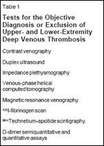 Because the diagnosis of venous thromboembolism solely on clinical grounds is insensitive and nonspecific, objective diagnostic confirmation is mandatory.[6] Currently available modalities for the objective diagnosis and exclusion of upper- and lowerextremity DVT include imaging techniques and biochemical assays (Table 1). Of these, impedance plethysmography (insensitive in cancer patients) and iodine-125- fibrinogen scanning have largely been replaced by duplex ultrasound and will not be discussed in this review. Venous duplex ultrasound is the most widely used test due to the combination of accuracy, noninvasiveness, short examination time, portability of newer equipment, and lower cost.