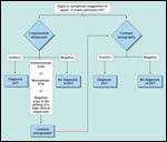 Regardless of the initial diagnostic approach, an indeterminate or negative scan should be followed by a duplex ultrasound of the legs and arms, in those with upper-extremity symptoms of pain, swelling, or an indwelling catheter. A positive duplex ultrasound does not confirm pulmonary embolism, but detection of acute DVT will prompt and justify acute systemic anticoagulation. In the absence of acute DVT, pulmonary angiography is necessary to confirm or exclude pulmonary embolism, particularly in those with an indeterminate V/Q scan or spiral CT. With the spiral CT-based approach to pulmonary embolism diagnosis, the presence of an alternative diagnosis that does not fully explain the patient's symptoms should be considered an indeterminate finding, in which case further work-up with pulmonary angiography is indicated.