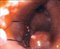 1. The answers are (b) evidence of residual Barrett's epithelium and (e) an area of suspicious columnar lining. In endoscopic photograph A, there is no evidence of mass, ulceration, or diverticulum. Between the 3 and 6 o'clock positions in photo A, there is evidence of squamous re-epithelialization in areas previously lined with columnar epithelium. The remaining mucosa represents residual Barrett's lining. The photograph also demonstrates a patch of suspicious mucosa in the upper portion of the photograph, especially between the 11 and 12 o'clock positions.