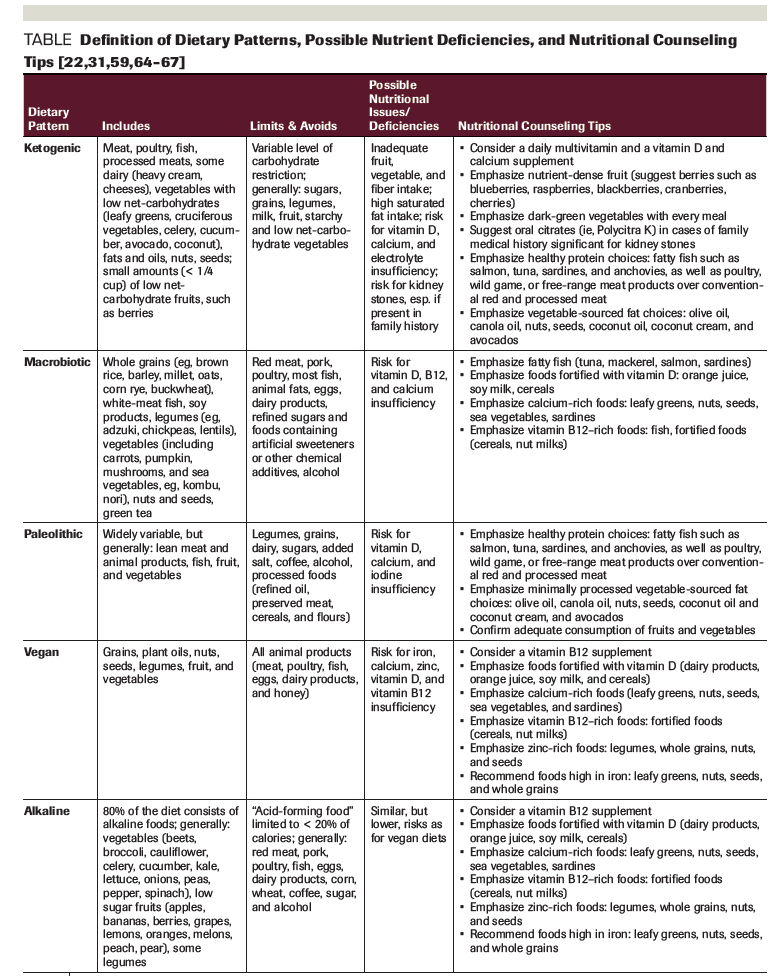 Table. Definition of Dietary Patterns, Possible Nutrient Deficiencies, and Nutritional Counseling Tips