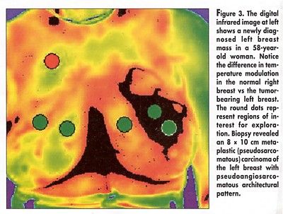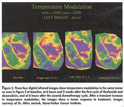 The Dana-Farber researchers performed 27 sets of CT scans, FDG-glucose PET scans, and digital infrared images (at baseline and at 1-month intervals) in 14 patients with soft tissue sarcomas receiving a variety of drug treatments. On digital infrared imaging, tumor masses were identified as areas of increased heat distribution and increased modulation (or oscillation) of temperature (blood vessel oscillations).