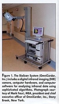 The Dana-Farber researchers are using the BioScan System (OmniCorder Technologies, Stony Brook, NY), which consists of a digital infrared camera that "counts" photons (electromagnetic radiation) emitted from tissues and organs, and sophisticated computer software that analyzes changes in the photon flux to map patterns of blood perfusion in tissues (see Figure 1). The results can be viewed on a monitor or printed out as hard copy.