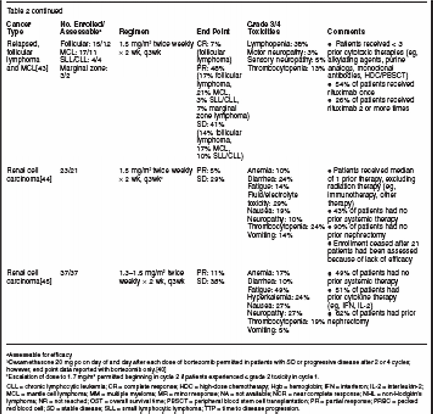 Phase II clinical trials have evaluated bortezomib administered twice weekly for 2 weeks, with cycles repeated every 3 weeks, as treatment of solid tumors (bortezomib alone) or hematologic malignancies (bortezomib alone or in combination with dexamethasone) (Table 2).[25,38-44] The largest study, the SUMMIT trial, evaluated bortezomib in 202 patients with multiple myeloma who had received a median of six prior therapies (see Table 2).[25,38] Of 193 assessable patients, 7 patients (4%) achieved a complete response, 12 (6%) acheived a near complete response, and 34 (18%) achieved a partial response; responses occurred independent of the number and type of previous therapies.[38] Additionally, response rates in patients with a chromosome 13 abnormality, a poor prognostic indicator, and patients without this abnormality did not differ.[25] The median time to disease progression in all 202 patients receiving bortezomib was 7 months, which was significantly longer than the median time to disease progression (3 months) with the last prior treatment patients had received before study entry (P = .01).[38] Table 2 lists the grade 3 and 4 toxicities associated with bortezomib administration. A smaller study (the CREST trial) evaluated bortezomib in 54 patients with relapsed or refractory multiple myeloma who had received a median of three prior therapies.[39] Bortezomib 1 or 1.3 mg/m2 was administered using the same schedule as that in the SUMMIT trial (see Table 2).[39] The overall response rate (complete plus partial response) in 53 assessable patients was 30% and 38% for the 1- and 1.3-mg/m2 groups, respectively, with one complete response observed at each dose level.[39] The median time to disease progression was 212 days for the 1-mg/m2 group and 333 days for the 1.3-mg/m2 group.[39] In both the SUMMIT and CREST trials, patients with disease progression or stable disease after two and four cycles, respectively, could receive dexamethasone 20 mg orally on the day of and the day after bortezomib administration; 78 patients in the SUMMIT trial and 28 patients in the CREST trial received dexamethasone.[ 40] The addition of dexamethasone improved response rates in 18% and 33% of patients in the SUMMIT and CREST trials, respectively, including patients refractory to dexamethasone alone. The median time to disease progression for these patients was 5.7 months (SUMMIT) and 6.8 months (CREST). Importantly, the addition of dexamethasone did not increase toxicities associated with single- agent bortezomib.[40] A phase II study evaluated bortezomib 1.3 mg/m2 in patients with mantle cell lymphoma (MCL) who had received 0 to 2 prior therapies.[41] Of 13 assessable patients, 5 patients (38.5%) experienced a partial response and 5 patients (38.5%) experienced stable disease. Five patients experienced treatment-limiting fluid retention and/or dyspnea. Therefore, the investigators modified the protocol to exclude patients with preexisting fluid retention or dyspnea.[41] Two additional phase II studies have evaluated 1.5 mg/m2 bortezomib in patients with relapsed or refractory NHL.[42,43] In one study, patients with MCL experienced a 48% response rate (complete, 26%; partial, 22%). Responses were also observed in other B-cell lymphomas, including one complete response (follicular lymphoma) and two partial responses (one diffuse large cell lymphoma, one Waldenstrm's macroglobulinemia).[ 42] A second study produced similar results, with an overall response rate of 55%, including a 7% complete response rate (follicular lymphoma) and 48% partial response rate (17% follicular lymphoma, 21% MCL, 3% small-cell lymphocytic lymphoma-chronic lymphocytic leukemia, 7% marginal zone lymphoma).[ 43] Toxicities in both studies were manageable, with the most common grade 3 or 4 toxicities being thrombocytopenia and lymphopenia, respectively (see Table 2).[42,43] Bortezomib 1.5 mg/m2 has also been evaluated in patients with stage 4 renal cell carcinoma who had received minimal pretreatment (median: 1 prior therapy).[ 44] Dose escalation to 1.7 mg/m2 was permitted beginning with cycle 2 in patients who developed less than or equal to grade 2 toxicities during cycle 1. Twenty-one patients received a total of 74 treatment cycles: 34 cycles at 1.7 mg/m2, 36 at 1.5 mg/m2, and 4 at 1.3 mg/m2. One patient had a partial response, and six patients had stable disease; enrollment in this study was ceased because of a lack of response. Toxicities reported were similar to toxicities reported in other trials (see Table 2). Although 10% of patients experienced grades 3 or 4 neuropathy, the incidence for all grades of neuropathy was 47%. A correlation between the number of doses given or the cumulative dose of bortezomib and the development of neuropathy was not observed. Kondagunta and colleagues[45] conducted a similar study in 37 metastatic renal cell cancer patients who had either received no prior therapy (49%) or cytokine therapy alone (51%). Bortezomib 1.5 mg/m2 was administered to the first 25 patients enrolled in the study; however, the dose was decreased to 1.3 mg/m2 for the subsequent 12 patients, because more than 50% of the patients receiving bortezomib 1.5 mg/m2 required toxicity-related dose reductions, primarily due to grade 2 or 3 peripheral neuropathy, fatigue, thrombocytopenia, and anemia. A partial response was observed in 4 patients (11%) and stable disease in 14 patients (38%). In the four patients with a partial response, durations of response ranged from 8 to more than 20 months. The median time to disease progression was 1.4 months and the median survival time was 7.5 months (median follow-up: 11.7 months [range: 3.7- 20.9 months]). Peripheral neuropathy occurred in 27% of all patients, 28% of patients receiving bortezomib 1.5 mg/m2, and 25% of patients receiving 1.3 mg/m2. The authors concluded that only a small portion of patients with renal cell carcinoma are likely to respond to bortezomib therapy and do not recomme