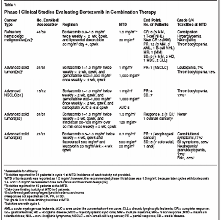 During cycle 1, grade 3 or 4 adverse events at the maximum tolerated dose included thrombocytopenia, constipation, neuropathy, and hyperglycemia; however, repeated administration of the first-cycle maximum tolerated dose necessitated dose reductions and delays.[29] Therefore, the dose recommended for phase II trials (ie, bortezomib 1.3 mg/m2 twice weekly for 2 weeks and liposomal doxorubicin 30 mg/m2 on day 4, with cycles repeated every 3 weeks) was lower than the maximum tolerated dose reported during cycle 1. This combination displayed disease activity not only in patients with multiple myeloma, but also in patients with acute myelogenous leukemia, non- Hodgkin's lymphoma (NHL), Hodgkin's disease, myelodysplastic syndromes, and chronic lymphocytic leukemia. As in phase I studies evaluating bortezomib alone, PI was dose dependent and did not increase with the use of liposomal doxorubicin.[29] Phase I studies assessed bortezomib combined with either gemcitabine, gemcitabine and carboplatin (Paraplatin), irinotecan, or 5-FU/leucovorin, in patients with solid tumors (see Table 1).[30-33] Various doses of bortezomib and gemcitabine were evaluated; the maximum tolerated dose was bortezomib 1 mg/m2 and gemcitabine 1,000 mg/m2.[30] Table 1 lists the toxicities at the maximum tolerated dose. One patient with relapsed metastatic NSCLC experienced a partial response despite previous treatment with numerous chemotherapy agents, including gemcitabine. Activity of bortezomib in NSCLC was also reported with gemcitabine and carboplatin.[31] The maximum tolerated dose in this trial was bortezomib 1 mg/m2, gemcitabine 1,000 mg/m2, and carboplatin at an area under the concentration-time curve of 5 (see Table 1). Four patients experienced a partial response and seven patients experienced stable disease.[ 31] In the irinotecan-bortezomib trial, the maximum tolerated dose was bortezomib 1.3 mg/m2 and irinotecan 125 mg/m2.[32] Although concern about additive toxicities, particularly diarrhea, exists with this combination, no grade 3 or 4 adverse events were reported at the maximum tolerated dose. Two patients, one with gastroesophageal junction adenocarcinoma (unconfirmed) and one with ovarian cancer, achieved a response (unspecified). Weekly 5-FU/leucovorin has also been evaluated with bortezomib (see Table 1).[33] The maximum tolerated dose was bortezomib 0.7 mg/m2 with 5-FU 500 mg/m2, and leucovorin 20 mg/m2. One patient with esophageal cancer experienced a partial response and eight patients with either colorectal cancer or anal cancer experienced stable disease.[33] Several other phase I or I/II studies are evaluating bortezomib in combination with chemotherapy agents, including liposomal doxorubicin, docetaxel, and carboplatin.[34-37] The results of these and ongoing phase I trials evaluating single-agent bortezomib are eagerly awaited and may define the optimal regimen of bortezomib as a single agent or in combination with other agents.