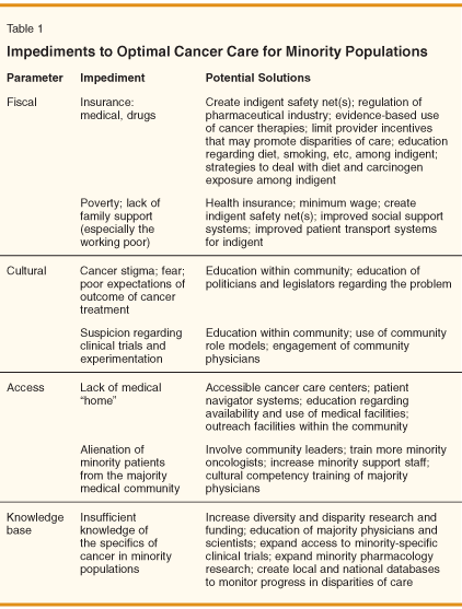 There is an increased incidence of cancer in minority populations, accompanied by reduced survival. This review will address specific areas of disparity in cancer care, including prevention, diagnosis, treatment, and outcomes, and will consider steps toward resolving these issues.