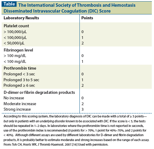 Table: The International Society of Thrombosis and Hemostasis Disseminated Intravascular Coagulation (DIC) Score