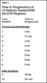 Response rates were determined by CT scans using criteria for partial response of ≥ 50% reduction in one dimension of the dominant mass that lasted > 4 weeks. Time to progression was determined from the time DVS treatment was initiated until radiologic evidence of an increase of > 25% in one dimension of the dominant mass.