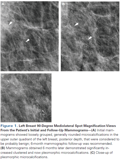 A 46-year-old woman had a routine screening mammogram that showed new calcifications in the posterior left breast. A diagnostic mammogram showed several small punctate calcifications, and a 6-month interval follow-up was recommended.