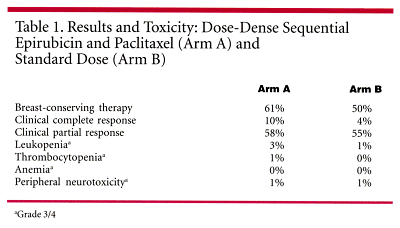 Breast conserving therapy was performed in 61% of patients receiving the dose-dense regimen as compared with 50% for the epirubicin/paclitaxel standard arm (P = .02). Lumpectomy with free margins was noted in 40% of dose-dense patients and 25% of standard dose patients. Histologically negative nodes were found in 50% of the dose-dense arm and 41% of the standard arm.