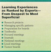 In preparation for ASTRO, Dr. Hussey said, he asked a group of experts to rank educational venues according to the depth of the learning experience. The experts, who were mainly ASTRO leaders and educators, ranked preparing for boards in the top three deep-learning experi-encesafter research projects and managing specific patients. National meetings, such as the ASTRO meeting, did not fare as well; only local meetings and tumor boards were described as more superficial (see Table).