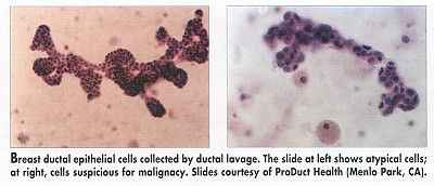 Eleven women with suspicious or malignant lavage findings have undergone surgical exploration to date. Four cases of ductal carcinoma in situ (DCIS), five cases of multiple papilloma, and two cases of fibrocystic disease were found. Before surgery, these women had repeat mammography with unsuspicious findings. Long-term follow-up is needed to determine the sensitivity and specificity of ductal lavage, Dr. Dooley said.
