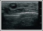 A 30-year-old female at 6 weeks’ gestation of a highly desired pregnancy presented to our multidisciplinary breast cancer clinic with a new diagnosis of invasive ductal carcinoma of the right breast. The patient had just become aware of her pregnant state when she noted a mass in her right breast on self-examination. She was evaluated with a diagnostic mammogram with proper shielding and an ultrasound, confirming a 1.4-cm solid mass corresponding to the palpable lesion (Figures 1 and 2). Ultrasound-guided core needle biopsy was obtained and revealed a grade 3/3 invasive ductal carcinoma, estrogen receptor (ER)-negative, progesterone receptor (PR)-negative, and human epidermal growth factor receptor 2 (HER2)-negative. On physical exam, she showed changes to the breast tissue consistent with early pregnancy, a palpable mass at the biopsy site, and no axillary adenopathy or contralateral findings. The remainder of her examination was likewise benign.