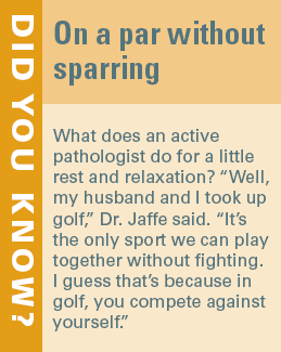 Dr. Jaffe never struggled with the research versus practice conundrum that many medical students face: Her first glimpse of tissues samples under a microscope made medicine come alive for her.