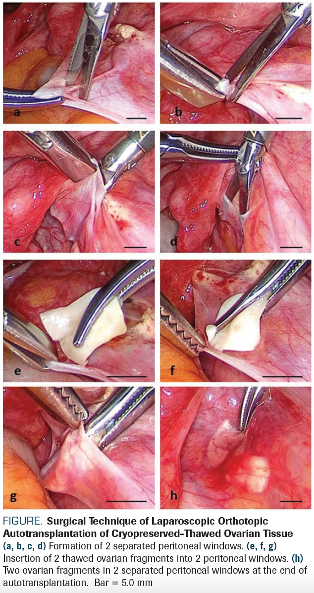 Technically, autotransplantation of cryopreserved-thawed ovarian tissue can be performed orthotopically into the remaining ovary, ovarian fossa, or broad ligament, or heterotopically into the subcutaneous space of the anterior abdominal wall or forearm. So far, the most successful method seems to be laparoscopic orthotopic autotransplantation of cortical ovarian tissue that was slowly cryopreserved then rapidly thawed.7 In the Figure, we show the standard surgical technique of laparoscopic orthotopic autotransplantation of cryopreserved-thawed ovarian tissue as performed in the Department of Obstetrics & Gynecology at the University of Cologne.8