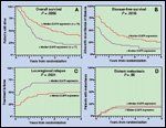 Confirming these findings, Ang et al conducted an IHC analysis of tumor specimens of patients with locally advanced HNSCC treated in a Radiation Therapy Oncology Group study (RTOG 90-03) evaluating outcomes based on different radiation schedules.[6] Of the 155 specimens available for analysis, 95% had detectable EGFR expression. As shown in Figure 2, high (> median) EGFR expression was significantly correlated with poorer overall and lower disease-free survival rates in multivariate analyses (P = .003). Interestingly, no correlation was noted between EGFR expression and common elements currently used to predict prognosis (eg, T stage, N stage, or the American Joint Committee on Cancer stage grouping). Patients with tumors expressing higher levels of EGFR had significantly higher locoregional recurrences than those with lower EGFR-expressing tumors. Unexpectedly, EGFR expression was even a stronger predictor of locoregional control than T stage in multivariate analysis.