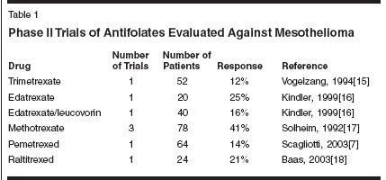 Vogelzang NJ, Weissman LB, HerndonJE II, et al: Trimetrexate in malignant mesothelioma:A Cancer and Leukemia Group B phaseII study. J Clin Oncol 12:1436-1442, 1994.