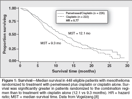 Manegold C, Symanowski J, GatzemeierU, et al: Secondary (post-study) chemotherapyin the phase III study of pemetrexed + cisplatinvs. cisplatin in malignant pleural mesotheliomais associated with longer survival (abstract2684). Proc Am Soc Clin Oncol 22:667, 2003.