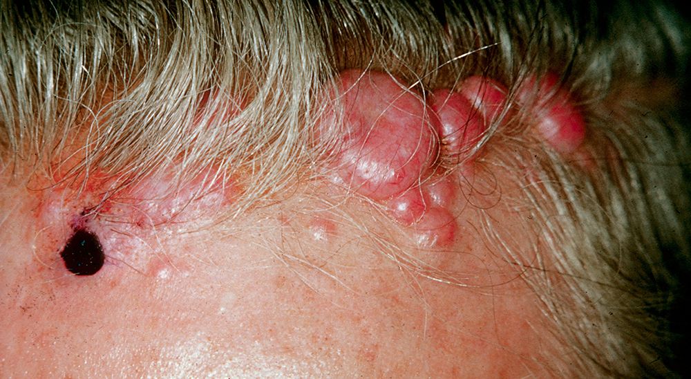 A 56-year-old Caucasian male presented with an approximately 25-year history of gradually enlarging, asymptomatic scalp nodules. His father, unavailable for examination due to his death in an auto accident decades earlier, had a nearly lifelong history of many 2-mm to 3-mm flesh-colored papules both in his nasolabial folds and on his upper lip. The patient’s sister had similar scalp nodules. Results of a recent routine laboratory panel were entirely normal. One medium-sized nodule was removed by deep shave biopsy and submitted for histologic examination. It demonstrated large, lobulated nests of basaloid cells arranged in a jigsaw puzzle pattern.