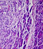 Micrograph of metastatic melanoma cells, left, that have invaded pancreatic tissue, right