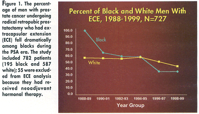 The study examined data on prostatectomy patients between 1988 and 1999. Over that period, the improvement in pretreatment PSA levels was "dramatic" for both races, with cancers being caught earlier in the disease course and among men of younger ages. The lowering of age at diagnosis, he indicated, is a "first sign" of a successful screening technique.