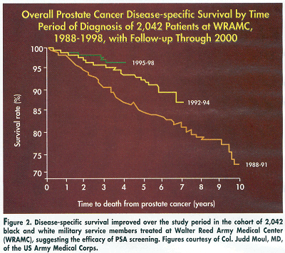 These results are "not definitive proof for screening efficacy," he said. The findings "could be explained by lead time, but we think it’s real." It is, at present, too early to make this determination based on the "gold standard" of disease-specific mortality determined by true population-based randomized studies. In his opinion, however, all men should consider having a baseline PSA at age 40.