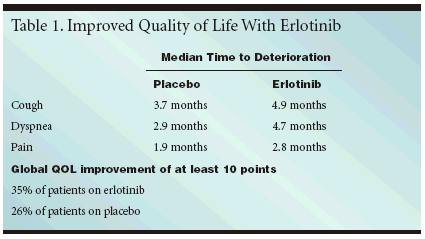 TORONTO, Canada-Erlotinib(Tarceva) not only extended survivalin patients with advanced non-smallcelllung cancer (NSCLC) but it alsoimproved their quality of life (QOL),according to data from BR.21, a double-blind randomized placebo-controlledtrial in 731 patients. Pain, cough,and dyspnea got worse at a slower rateamong patients who took erlotinibthan among those who took placeboon the trial, which was conducted bythe National Cancer Institute of Canada(NCIC).The primary findings of BR.21, reportedlast year, showed that erlotinibsignificantly improved median overallsurvival time and 1-year survival, comparedwith placebo, in patients withpreviously treated stage IIIb or IVNSCLC. The QOL data from BR.21were reported by Andrea Bezjak, MD,who led the QOL analysis (abstract7018). Dr. Bezjak is associate professorin the departments of radiation oncologyand health policy, managementand evaluation at the University ofToronto, and is a staff radiation oncologistat Princess Margaret Hospital,Toronto."Patients on erlotinib had slowerdeterioration of their disease-relatedsymptoms and quality of life improvedin more patients on the erlotinib armthan on the placebo arm," Dr. Bezjaksaid. "These differences were clinicallyas well as statistically significant."To collect the data, Dr. Bezjak andher colleagues used the QOL core questionnaireand lung cancer module ofthe European Organization for Researchand Treatment of Cancer(EORTC); the questionnaire was administeredmonthly. Compliance wasexcellent, Dr. Bezjak noted, with 85%of patients completing questionnairesin the first year.