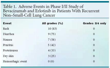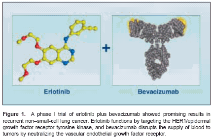 CHICAGO-Encouragingearly results reported from a phaseI trial of bevacizumab (Avastin) pluserlotinib (OSI-774, Tarceva) in patientswith recurrent non-small-celllung cancer (NSCLC) have boostedinterest in testing combinations ofnovel agents, according to a reportpresented at the 39th Annual Meetingof the American Society of ClinicalOncology (ASCO) (ASCO abstract2521) (Figures 1 and 2).The combination not only showedantitumor activity, but also was welltolerated by the first 12 patients in thestudy. Three had a partial response(producing a response rate of 25%),and five had stable disease (a rate of42%). Although a majority of patientsexperienced rash, diarrhea, and/ornausea, no adverse events reachedgrades 3 or 4, and no bleeding wasrecorded (see Table 1)."We're very excited," senior investigatorRoy S. Herbst, MD, PhD, ofthe University of Texas M. D. AndersonCancer Center, Houston, toldONI. "Now we have 25 patients. Twentyhave been evaluated, and we stillhave a response rate of 25%. Evenmore importantly, the drugs are safe.You can give a full dose of Avastin, afull dose of Tarceva."Eric D. Mininberg, MD, a seniormedical oncology fellow at M. D.Anderson Cancer Center, reported thepreliminary results in a poster sessionand Dr. Herbst used them as the basisfor his presentation at a post-ASCO,industry-sponsored, satellite symposium,"Targeting Critical Pathways inOncology."
